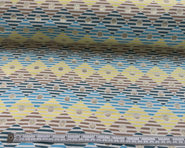 Woven jacquard cotton fabric. Diamond design in yellow, turquoise and cream with gold lurex.