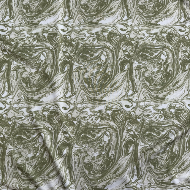 Stretch polyester fabric with a marble swirl pattern in olive green. This is a stretch fabric.