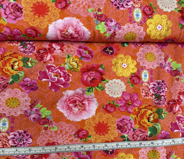 Organic cotton jersey in an orange or int collages with flowers and crochet.