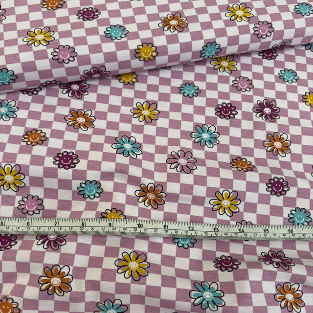 stretch cotton jersey with a fun print of smiling daisies on a lilac checkerboard background
