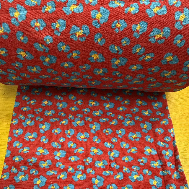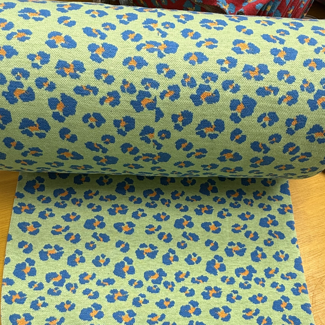 vibrant leopard print cotton jersey knitted as a tube 30 cm wide when flat so could be cut to a width of 60cm